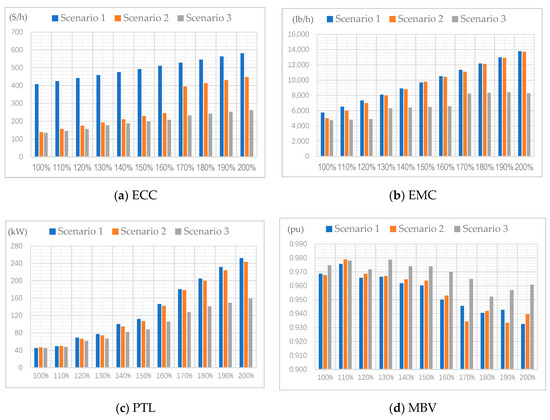 Compare Table 11 with Table 12, when the power demand increases from 100% to 200%, the PTL and MBV of the combination with two DEs, two MTs, and two FCs are 252.1833 kW and 0.9325 pu; the combination of auto-select mode are 243.3098 kW and 0.9396 pu. The optimal DG combination showed more considerable advantages in PTL and MBV with increased power demand. Nevertheless, the ECC and EMC of auto-select mode are $447.5775/h and 13,709.5232 lb/h that is much better than that of the fixed 6 DGs $580.3721/h and 13,777.4195 lb/h. With the increase of power demand in the distribution system, the fixed DG quantity makes the penetration level decreased. Table 13 shows relatively stable DG penetration levels by maximizing DGs’ deployment under the auto-select mode. Compared with Table 11 and Table 12, the ECC, EMC, PTL, and MBV in Table 13 are comprehensively improved due to the higher DG penetration level. The ECC, EMC, PTL, and MBV have also been improved to $261.6486/h, 8267.5435 lb/h, 159.0155 kW, and 0.9607 pu under the 200% power demand.