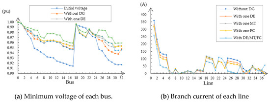 In this phase, the number of DE, MT, and FC deployed in the test system is restricted to 1, but the types of DGs are not limited in simulation. The results of system reconfiguration shown in Table 5 are effectively obtained due to the low computational complexity. For better comparing the changes brought by reconfiguration after deploying DG(s), a simulation without DG deployment is conducted as a reference. The open switches were changed to the optimal locations after reconfiguration.