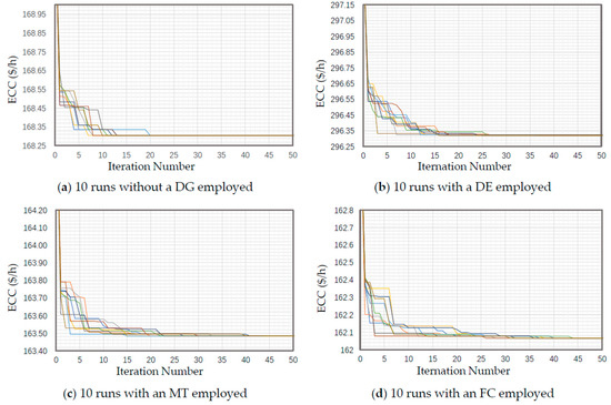 In order to reflect the convergence of the proposed algorithm, our simulation randomly selected ten results in the case of without DG deployment, with DE deployment, with MT deployment, and with FC deployment, respectively. Figure 5 shows the convergence of the proposed algorithm on ECC that the optimal solutions are obtained within a maximum of 20 iterations without DG deployment and within 44 iterations among the 30 runs while DG is deployed. Moreover, a fuzzy genetic algorithm (FGA) and fuzzy particle swarm optimization (FPSO) are implemented in the simulation to compare the convergence with the proposed FMFO on the PTL. As shown in Figure 6, 20 runs of FGA, FPSO, and FMFO are conducted separately to calculate the average PTL. The proposed FMFO algorithm shows advantages in both simulations deployed without DG and deployed with an MT. In the simulations without DG deployed, the FMFO, FPSO, and FGA obtained the optimal solutions at the average iteration numbers of 9.7, 14.9, and 34.2, respectively; and in the simulations with an MT deployed, the FMFO, FPSO, and FGA obtained the optimal solutions at the average iteration numbers of 13.6, 18.5, and 46.3, respectively.