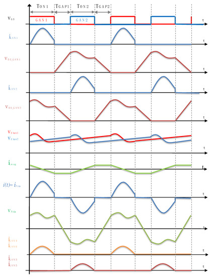For simplicity, we distinguish only two equivalent states: the conduction of one of the transistors in primary side (GAN1 or GAN2) (Ton = Ton1 = Ton2) and the non-conduction of both transistors (Tgap = TGAP1 = TGAP2). Transistors GAN3 and GAN5 of the synchronous rectifier conduct during the on time of the GAN2 transistor, whereas transistors GAN4 and GAN6 conduct during the on time of transistor GAN1.