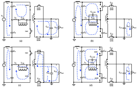out. Both the turning on and off of transistors GAN1, GAN4, and GAN6 occurs when the current flowing through them is zero. However, a small amount of current is circulating through them at these moments due to the magnetizing inductance of the transformer, which contributes to charging/discharging the parasitic capacitances.