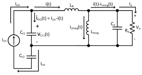 To simplify the process for obtaining the equations that define the behaviour of the circuit in the Ton time interval, the magnetizing current iLmag(t) was neglected because of its small value in relation to the overall current flowing through the primary of the transformer i(t). This reduced magnetizing current grows linearly during the Ton time interval since the voltage across Lmag is Vo.