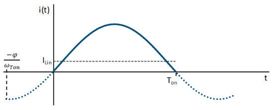 As Ton is already known, the value of the resonance frequency during the on state, ωTon, can be determined using numerical calculation of Equation (24).