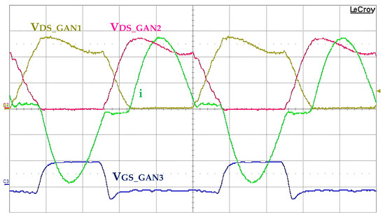 Figure 16 shows the 1 MHz experimental waveforms of the converter working at maximum output power (150 W). Both the drain-to-source voltage of the half-bridge transistors and the primary current were as expected for a ZVZCS resonant converter.