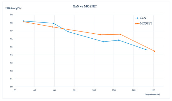 Figure 17. The obtained results for the 1 MHz GaN HEMT converter were compared with the achieved with another prototype working at 100 kHz and implemented using silicon MOSFET transistors. The experimental efficiencies of both prototypes were very similar.