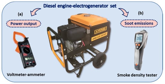 Scheme of methodology on a Diesel Engine-Electrogenerator Set to determine (a) power output by using a voltmeter–ammeter devise; (b) generated soot emissions by using smoke density tester.