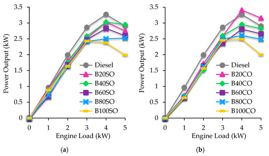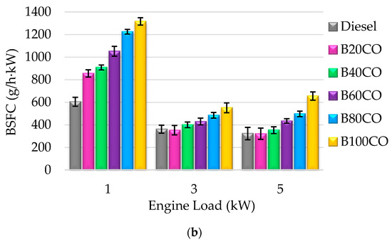 Figure 2 displays the variation in power output of engine fueled with the different triple mixtures composed by either sunflower oil (B20SO-B80SO), shown in Figure 2a, and castor oil (B20CO-B80CO), shown in Figure 2b, with engine loads of 0–5 kW and at same engine working conditions (Table 2). Additionally, the engine performances with diesel fossil fuel and the pure biofuels, B100SO and B100CO, are included as references for comparison. It is observed that power output slightly decreased as the percentage of DEC/SVO biofuel increases. This behavior can be attributed to the lower energy content of the proposed blends, in comparison to that of commercial diesel, as a consequence of the incorporation of diethyl carbonate, which exhibits a lower calorific value of 20.3 MJ/L (Table 1). Hence, the power output is decreased by 3–31% when blends containing sunflower oil are supplied to the engine (Figure 2a), whereas the blends with castor oil exhibit a reduction in the power output of 4–34%, as compared to diesel (Figure 2b). Nonetheless, it is remarkable how all studied blends give rise to power output values very similar and even, in some cases, better than those obtained with diesel. This is the case of the B20CO blend, which generates a power of around 4–9% higher than that of diesel at high engine loads (4 and 5 kW). Likewise, the B40SO blend presents an increase in power output of about 2% with respect to diesel when the highest demand of power is applied to engine (5 kW). On the other hand, if the use of both vegetable oils is compared, a slightly greater efficiency with mixtures that contain castor oil can be noted, probably because of their higher cetane number, which improves the ignition quality of fuel. Related to the impact of engine load on power output, it can be confirmed that, in general, when diesel fossil, or any of the evaluated (bio)fuels, are employed, the power output is higher, as the demanded power to engine is increased from 0 to 4 kW, while a rise in the power supply (5 kW) involves a slight drop in the output power of the engine. It is really interesting to note the fact that the pure biofuels, formulated exclusively with renewable compounds, although with a slight loss of power with respect to mixtures containing diesel, conducted through proper engine operation.