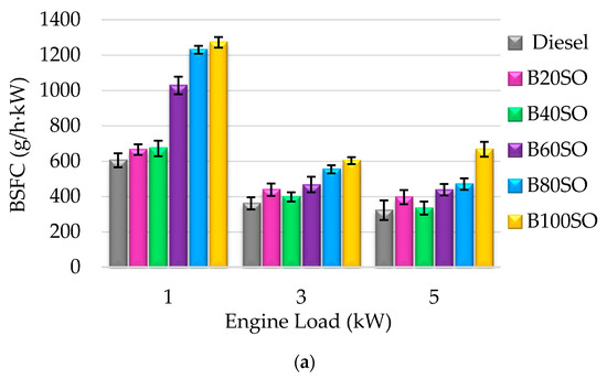 BSFC relates the consumed fuel by the engine with the power that it produces. This is an essential parameter to compare the efficiency of the engine. Figure 3 illustrates BSFC versus loads applied to engine (1, 3 and 5 kW) at constant operation conditions. A similar trend is observed with all tested fuel blends at the different loads. As expected, the BSFC values obtained at low engine loads (1 kW) were higher than those obtained at medium or high loads (3 and 5 kW). The decrease in the BSFC values as the engine load increases has been previously explained by the fact that an increase in the load raises the in-cylinder temperature, thus improving the combustion process [34]. A stabilization in BSFC happens when the highest engine load (5 kW) is applied. Overall, the results obtained show that the substitution of fossil diesel by the tested fuel blends at any load, involves an increment in BSFC, independently of used vegetable oil. This is ascribed to the lower energy content of the blends containing DEC, since its calorific value is considerably lower than that of diesel fuel (Table 1). Additionally, the higher density of the blends in comparison with diesel involves a larger volume of fuel introduced into the cylinder, which causes an increase in BSFC. Therefore, the engine needs a higher volume of fuel to attain the corresponding power output when it is fueled with the blends containing SVOs and DEC. However, there are no major differences between the fuel blends and diesel at medium and high loads. In fact, BSFC values are very similar to those of diesel in B20 and B40 fuels in cases where they contain either SO or CO. Since these blends exhibit comparable cetane number and lower calorific value with diesel, its better behavior can be explained by the presence of oxygen in its composition, which contributes towards improving the combustion reaction and, as a result, the power output of the engine is enhanced. In this way, the oxygen content of fuel mixtures overcomes the reduction in calorific value. Nevertheless, the influence of other factors, such as boiling point, viscosity, auto-ignition temperature, etc., cannot be ruled out. On the other hand, the slightly higher BSFC of the mixtures composed by castor oil (Figure 3a), compared with sunflower oil (Figure 3b), could be ascribed to the lower energy density of these blends, which reduce the power output of the engine.