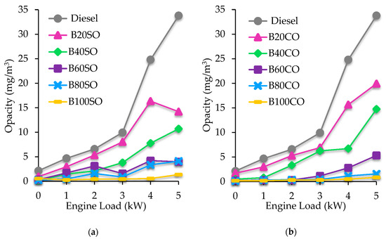 Opacity values (mg/m3) at engine loads from 0 kW to 5 kW, for the fuel blends: (a) DEC/SO and D/DEC/SO; (b) DEC/CO and D/DEC/CO.