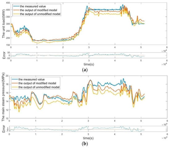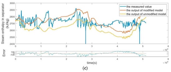 Comparison between measurements (blue line), unmodified (yellow line) and modified model (orange line) for: (a) unit load; (b) main steam pressure; (c) steam enthalpy in separator; Reprint with permission []; 2019, Elsevier.