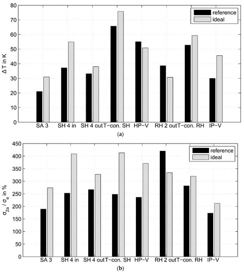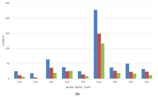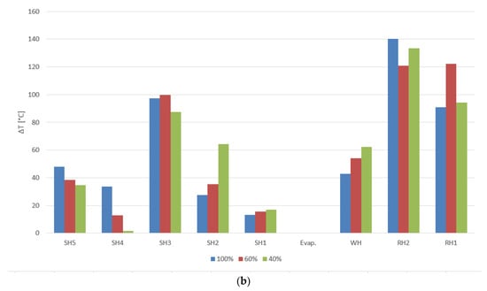 Comparison of heat exchangers for different load levels (100% blue, 60% red, 40% green) for: (a) power Q; (b) steam temperature difference ∆T at the inlet and outlet for each heat exchanger; Reprint with permission []; 2017, IOP Publishing Ltd.