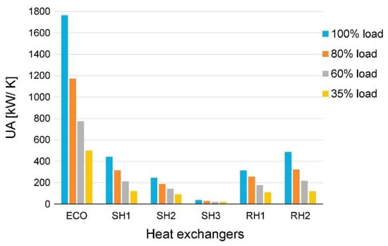 UA factor of boiler heat exchangers at various operation loads (100% blue, 80% orange, 60% grey, 35% yellow); Reprint with permission []; 2017, Elsevier.