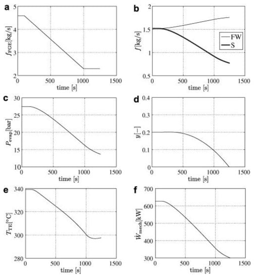 Transients for a 50% ramp decrease of the entering flue-gas mass flow at design conditions: (a) ramp on flue-gas mass flow (fFGE); (b) feedwater (fFW) and steam (fC) mass flows; (c) evaporator pressure (Pevap); (d) volume fraction of steam inside the evaporator (y); (e) turbine-inlet temperature (TTE) and (f) turbine mechanical (mech); Reprint with permission []; 2007, Elsevier.