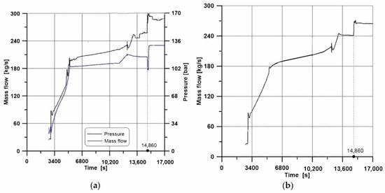 (a) Changes in the mass flow rate of steam and pressure at the SH4 (SuperHeater) outlet (at the boiler outlet) in the entire time of operation; (b) The mass flow rate of steam at the evaporator outlet in the entire period of operation under analysis; Reprint with permission []; 2019, Elsevier.