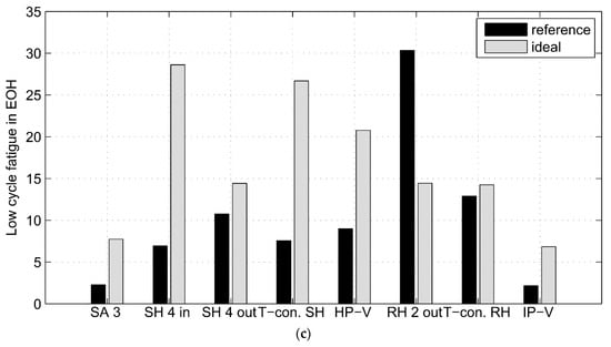 Simulation results during hot start-up for 8 of the most critical thick-walled components (SA3: spray attemperator 3. SH4 in/out: superheater 4 inlet/outlet, T-con. SH/RH: turbine connection to superheater/reheater, HP/IP-V: high/intermediate pressure valve, RH 2 out: reheater 2 outlet): (a) Maximum wall-temperature difference; (b) Maximum stress amplitude to endurance strength ratio; (c) Low cycle fatigue (EOH: equivalent operating hours);Reprint with permission []; 2017, Elsevier.