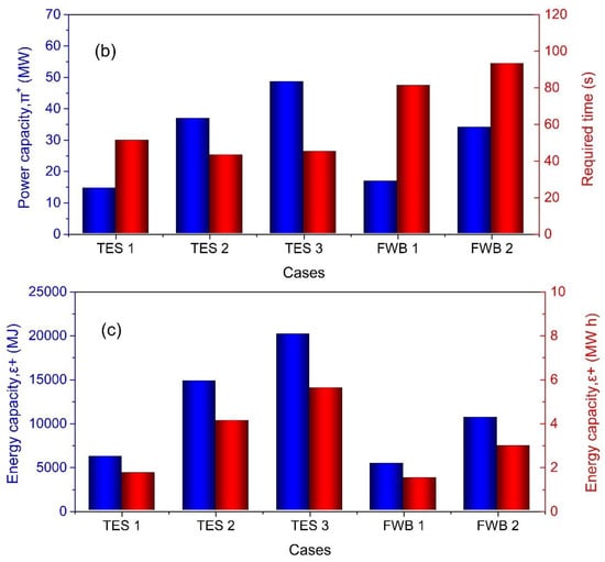 Operational flexibility metrics of a power system under 5 distinct measures (TES1/2/3: throttling extraction steam scenarios 1/2/3, FWB1/2: feedwater bypass scenarios 1/2): (a) Average power ramp rate within 1 min; (b) Power capacity and required time; (c) Energy capacity; Reprint with permission []; 2018, Elsevier.
