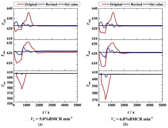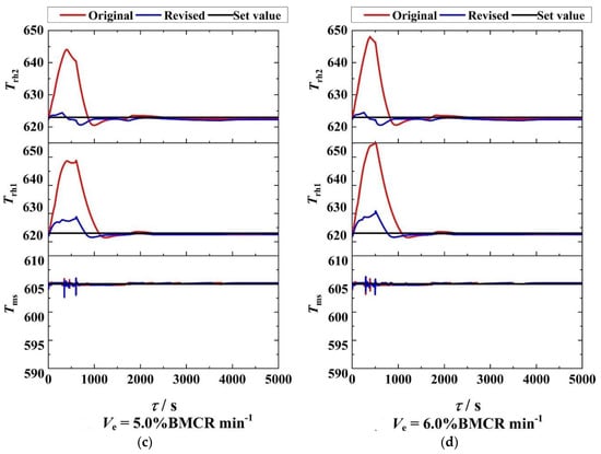 Real-time steam temperatures (rh2: reheater 2, rh1: reheater 1, ms: main steam) with original and revised logics (BMCR: boiler maximum continuous rate): (a) During the loading-up process with 5% BMCR/min rate; (b) During the loading-up process with 6% BMCR/min rate; (c) During the loading-down process with 5% BMCR/min rate; (d) During the loading-down process with 6% BMCR/min rate; Reprint with permission []; 2020, Elsevier.
