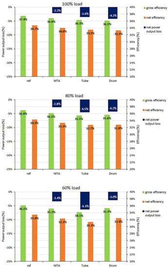 Comparative graphs for three loads with all three drying technologies (ref: reference, (Wirbelschichttrocknung mit interner Abwärmenutzung) WTA: fluidized-bed dryer with internal waste-heat use (WTA dryer), Tube: tube dryer, Drum: drum dryer); Reprint with permission []; 2019, American Society of Civil Engineers.