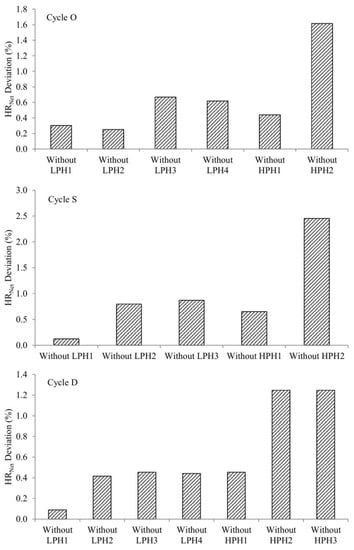 The scenario of one water preheater being out of service to maintain full-load operation was investigated in []. Three different thermodynamic cycles with dissimilar capacities—160, 210, and 434.7—were modeled with THERMOFLEX® software. All three cycles had different regenerative layouts and were simulated with one feedwater-preheater set out of order. Simulation results yielded an increase of the heat rate of the cycle when superheated, and reheated steam temperatures were kept constant (Figure 12). The higher the preheater pressure, the higher the impact. The exclusion of a feedwater preheater redistributed the steam-extraction flows with highest impact on the downstream feedwater heater. The decision to exclude the highest-pressure feedwater preheater was proposed as a strategy for full-load operation retention, when superheated and/or reheated steam temperature declined.