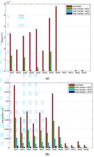 The start-up optimization of an existing lignite-fired power plant was discussed in []. The plant was modeled in Modelica®/Dymola language and Modelon ThermalPower library. The control system was incorporated into the model. Thick-wall components were modeled in detail as well. The model was validated against operational data retrieved from the plant. Cold, warm, and hot start-ups with different rates were simulated, and thick-wall components inner/outer surface temperatures results were generated. A thermal-stress and life-consumption methodology was implemented. The duration of start-ups could decrease by 30% and the oil consumption by 70%. The most stressed thick-wall components could be identified at different operation scenarios (Figure 7).