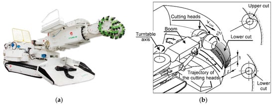 Figure 1a) are widely used in civil engineering for drilling roadways in underground mines and partly for drilling tunnels. Rock cutting is carried out using cutting heads armed with conical picks, located at the end of a movable boom. This helps in moving the cutting heads along the heading face of the tunnel, with the cutting technology adapted to the geological structure of the rock mass in which a given tunnel is drilled. In the most commonly used rock cutting technology, the cutting heads are moved parallel to the floor from one sidewall of the excavation to the other (