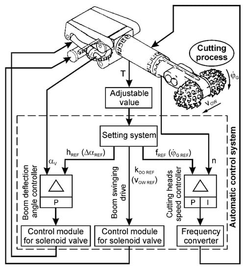The cutting process is not stationary. One reason for this is that the rock mass in which underground roadways and tunnels are drilled often has a layered structure. It is characterized by the separation of soft rock layers by hard rock layers lying in different ways in the cross-section of the drilled excavation. This means that the selection (correction) of the mining process parameters must be done online, as the cutting heads move along the heading face, which is possible only with the automatic control of the cutting heads movement. In the developed solution of such a system, the values of three of the four cutting process parameters are regulated: the angular speed of the cutting heads