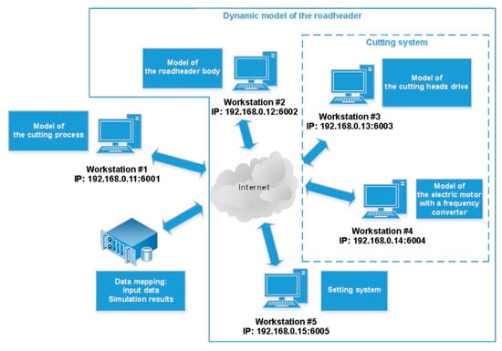 Figure 3). This system combines the software that solves the mathematical models of individual roadheader components and a model of the rock cutting process, as well as simulates the operation of the control system. As part of this simulation system, each computational model can run on a separate workstation. Data exchange between the individual computational models is achieved via the Internet. This system is equipped with a dedicated file server that stores all the essential files (configuration files and executables) as well as the data and simulation results [
