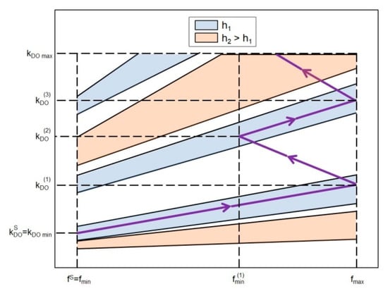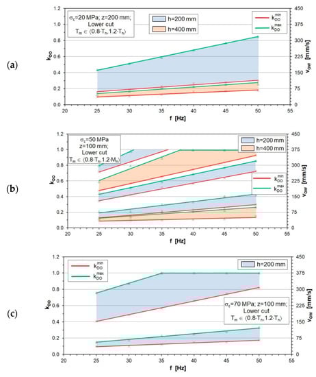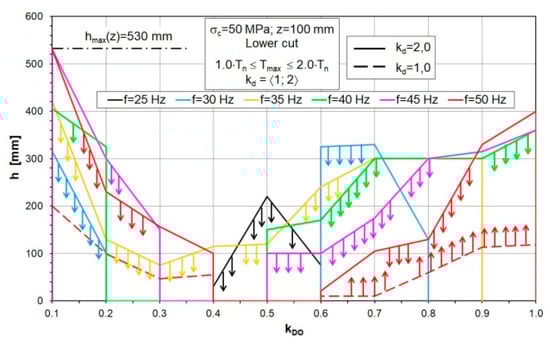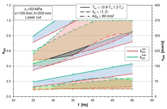 For a twofold higher cut height (h = 400 mm), the values of the supply voltage frequency f from the entire considered range correspond to that of the kDO coefficient from two ranges (areas in orange).