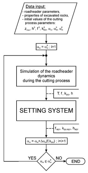 25]. For practical reasons, it has been assumed that the infinitely variable angular speed adjustment of the cutting heads will be implemented using a frequency converter that supplies the electric motor in the roadheader’s cutting system. The web of cut and mechanical parameters of excavated rocks are treated as random variables. The parameters of the cutting process are optimized in the setting system. This block, based on the response of the controlled object—the course of the adjustable value (dynamic load of the cutting heads drive), works out the set values of the cutting process parameters in subsequent rotation periods of the cutting heads. As the angular speed of the cutting heads is variable (programmable), these periods are variable.