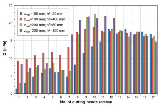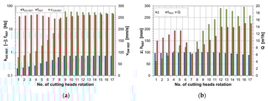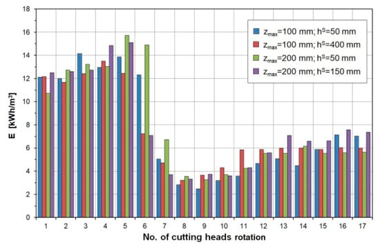 Figure 11b, green bars). In the range of the high boom swinging speed (cutting head rotations 7–17), the high cutting efficiency ensured the clear reduction of the energy consumption, which was at a low level, not exceeding 7 kWh/m