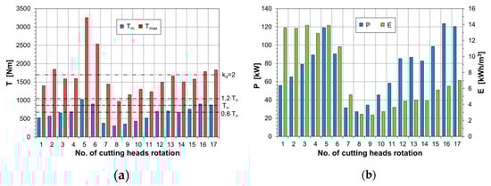 Figure 11b, blue bars). The power increased in the first two intervals of the boom swinging speed (cutting head rotations 1–6), reaching up to 120 kW, after which it started to decrease due to the reduction in the angular speed of the cutting heads and the cut height. In the range of the high boom swinging speed (cutting head rotations 7–17), the power gradually increased up to 120 kW. The energy consumption of cutting