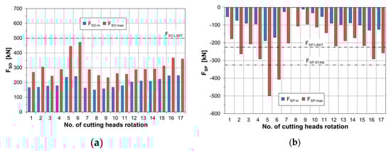 FSP STAB) corresponding to the force acting on the boom at which the roadheader will reach its stability. During the fifth and sixth rotations of the cutting heads, the above-mentioned limit was exceeded. Nevertheless, this condition existed only for a short duration, and the roadheader did not lose its stability.