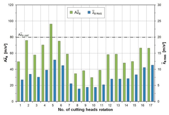 Figure 13). As can be seen, only during the fifth rotation of the cutting heads, the amplitude of the vibration acceleration exceeded the accepted level (