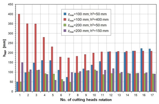hS = 400 mm (red bars). During the first six rotations of the cutting heads, the cut height was reduced more than twice. Due to the dynamic load of the cutting heads drive in this phase, for both the web of cut values considered, the lower limit of the initial cut heights was too small and the larger limit was too high. In the range of the medium boom swinging speed, the cut height decreased in all cases. By comparing the cuts with the same initial height (