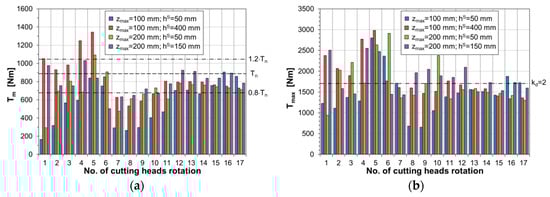 Figure 17a). This was especially noticeable in the range of the low boom swinging speed, during which the larger cross-section of the cut resulted in a higher load on the motor. In the range of the high boom swinging speed, the average values of the dynamic motor load in the cutting heads drive were equalized, almost reaching the nominal load value.