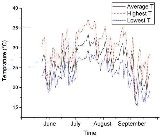 The survey in this study was conducted on a traditional street in Yiyang, a city in central China. The studied street is narrower than those in previous studies, and located in the subtropical humid climate zone, which is usually referred to as the hot-summer and cold-winter zone in China. Historical typical temperature profiles in this city during summer are presented in Figure 1, which shows that the daily average temperature ranges from 20 to 33 °C [17].