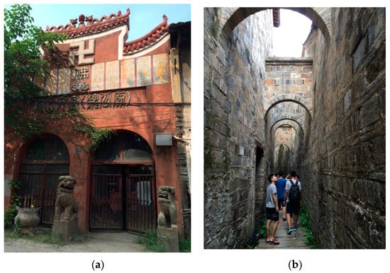 A traditional gorge in central China. (a) Front view of the temple; (b) Front view of the street.