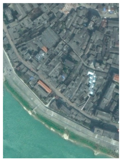 As shown in Figure 3, the old street is located near a river (marked with white color). The city is located at 28.6° N latitude and 112.3° E longitude. The lane is around 80 m long, 1 to 2 m wide, and surrounded with 6 to 8 m high walls on the east and west. Therefore, the width-to-height ratio ranges from 4 to 6.
