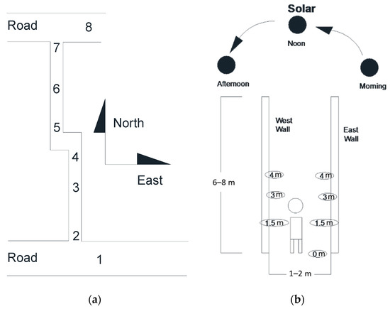 Figure 4a illustrates the eight measuring points, of which points 1 and 8 were outside the lane, and points 2 to 7 were inside the lane. At each point the dry-bulb air temperature, relative humidity, and air velocity were recorded by a hygrothermograph and anemometer. The surface temperatures inside the lane were measured by radiant thermometers, as shown in Figure 4b. During the three-day investigation, the measurement time and weather conditions are listed in Table 1.
