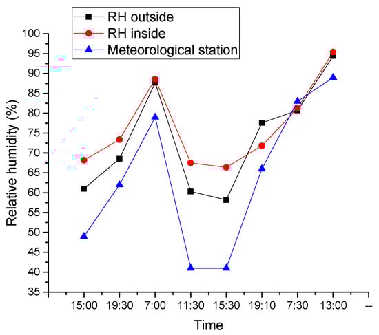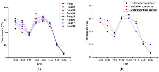 A total of 4 ONSET Temp/RH (relative humidity) Loggers were used to measure the air temperature (with accuracy of ±0.21 °C) and relative humidity (with accuracy of ±0.3.5%). Figure 5a presents the variation of temperatures of every measurement point at different times, which shows the same trend. Figure 5b shows that the difference between the inside and outside average air temperatures was less than 2 °C. There was a slight time lag of the inside temperatures following the outside temperature. This may be caused by radiant cooling and night-time ventilation, through which the walls could dissipate heat at night.