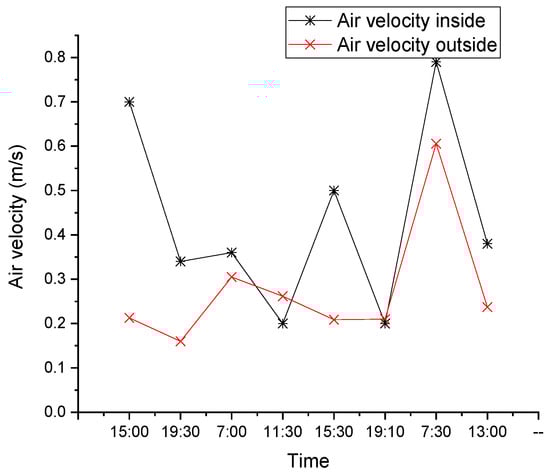 A hot wire anemometer was used to measure the air velocity with an accuracy of ±0.1 m/s and average values with an interval of 1 min to account for the fluctuations in air velocity. From Figure 6, it can be observed that the relative air humidity inside and outside the lane are similar, and both varied between 60% and 100%. As observed from Figure 7, the outside air velocity was higher than that inside most of the time, with less fluctuation. Compared with the wind speed in Table 1, which range from 0 to 4 m/s, the velocities measured are much lower than those from the local meteorological station. This is due to the highly crowded buildings in this city, which lower the wind speed near the ground.