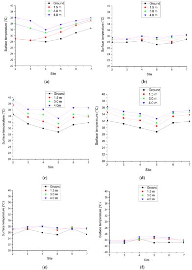 Two rectified radiation thermometers were used to measure the wall surface temperature at the same time, and the average value was used as the final reading. The accuracy of each thermometer is ±0.1 °C. Figure 8 presents the profiles of surface temperatures at the ground surface, 1.5, 3, and 4 m above the ground at positions 2 to 7 at different times. Figure 8a,c,d indicate strong solar radiation, and show that the temperature in the center (positions 4 and 5) was lower than those at the two ends (positions 2 and 7). The reason for this is uncertain and perhaps due to a better shading effect or higher air velocity inside the lane.