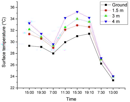 In Figure 10 it is observed that the surface temperatures increase when the positions are higher; the average gradient is 0.88 °C/m. This may be caused by different shading schemes that resulted in the variation of the solar radiation intensity on the wall surface at different heights. All of the surface temperatures dropped to almost the same value on the last day with an overcast sky.