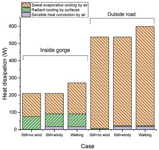 - Inside the gorge, the radiant heat dissipation accounts for about 30–40% of the total heat dissipation, which shows that the relatively low temperature of the ground and walls significantly cools the human body. Evaporative cooling accounts for 50–70%, which shows that sweating is essential in summer, even in the streets with shading. The proportion of sensible heat dissipation is very small. When people stand still and there is no wind, heat dissipation only accounts for 0.8%. When there is wind or when the pedestrian is walking, the proportion of heat dissipation rises to 8.2% and 6.4%, respectively. In this kind of street, compared to standing, the heat generated by walking can help increase the total body heat gain by 29%.