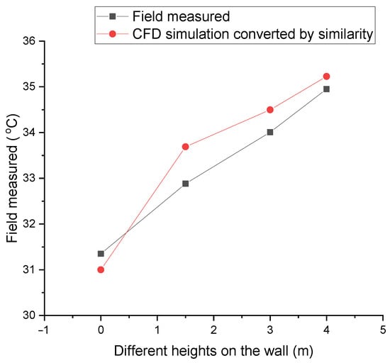 Based on Equation (15), the temperature data simulated by CFD was converted into measured data at the corresponding position. Figure 14 shows the average of the inner surface temperature of the Cold-Lane (east wall, ground, and west wall) at different heights at 15:00 on 25 August, based on field measurements and CFD simulations. It can be observed from this figure that the difference in the temperature between the CFD simulation and measurement is less than 1 K.