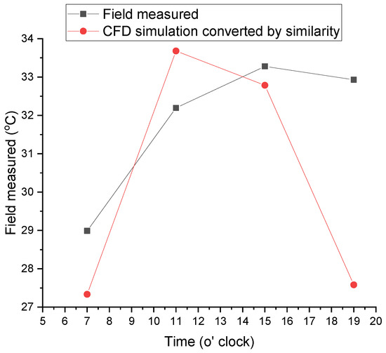 The comparison results at different times are shown in Figure 15. It can be seen that the CFD simulation value and the measured value has a similar trend. The average temperature difference between them is about 1.5 K with an error of 30%. Clearly, however, the measured temperature has a time delay, which may be caused by the heat storage of the wall and night-time ventilation.