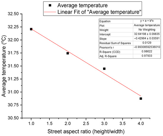 It can be seen from Figure 16 that the average temperature at the inner surface of the canyon in the block decreases with the increase in aspect ratio. The average ground temperature drops by 0.2 K with every 1 m increase in height; that is, with the aspect ratio of 1 as the benchmark, each time the aspect ratio increases by 100%, the average temperature drops by about 0.4 K.