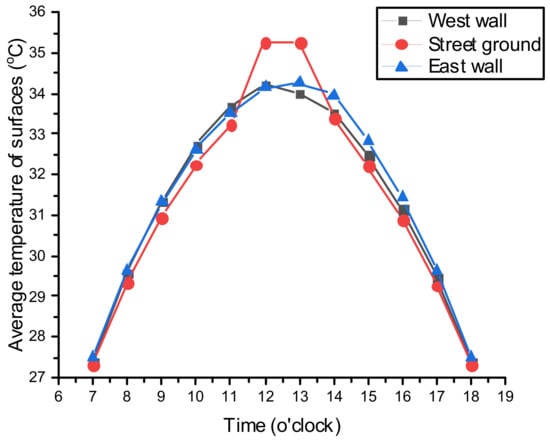 It can be observed from Figure 18 that the ground temperature of the street at noon is obviously higher than that of the east wall and the west wall, which is caused by the direct solar radiation on the ground. However, the ground temperature is the lowest in the morning and afternoon, which is due to the shading effect from the walls on both sides of the street.