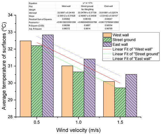 It is assumed that that the wind speed at the pedestrian height of 1.5 m increases from 0.5 m/s to 1 m/s and to 1.5 m/s, and the air temperature is 300 K at 3:00 pm on 25 August. As shown in Figure 19, for every 1 m/s increase in wind velocity, the surface temperature of the west wall, ground, and east wall drop by an average of 2.4 K. This indicates that increasing the wind speed can effectively reduce the wall temperature in the street canyon.