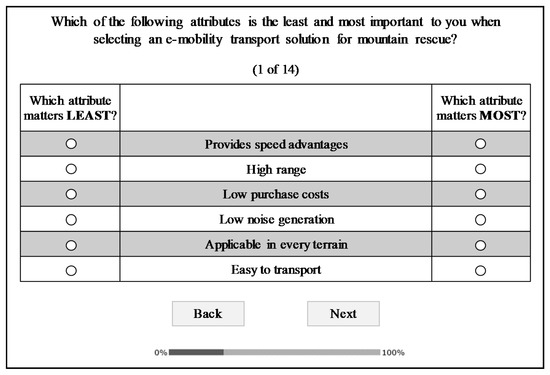 BWS is underpinned by the random utility theory, which assumes that an individual’s relative preference for object A over object B is a function of the relative frequency with which A is chosen as better than or preferred to B [82]. This methodology involves a cognitive process by which respondents repeatedly choose, from varying sets of attribute combinations, the attributes that they believe exhibit the largest perceptual difference in an underlying continuum of interest [83]. This is performed by observing the best and worst choices in a set of multiple options by repetitively combining the two choices. In a simple example of three choices “A”, “B” and “C”, “A” can be considered the best and “C” the worst. This ranking implies that “A” should be chosen for the pairs “AB” and “AC”, and “B” should be chosen for the third pair “BC”. Thus, the best and worst choices provide information that can be expanded to several pairs of choices [77]. This approach is called the case 1 BWS [84] and has previously been applied in the e-mobility domain in a study conducted by [85], wherein BWS was used to assess the importance of complementary mobility services to consumer behavior. Although contextually different, the study served as methodological guidance for the BWS analysis as presented in this article. Additionally, we followed the BWS steps as proposed by [86]. Accordingly, the first step comprised the setting of the study context followed by the identification of attributes. Then, the experimental design was formulated, and a survey was created and conducted. Ultimately, the acquired data were analyzed.